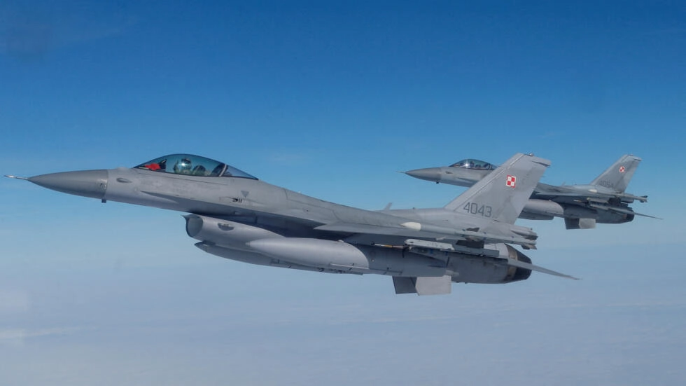 F-16 aircrafts fly during a NATO media event at an airbase in Malbork, Poland on March 21, 2023. © Lukasz Glowala, Reuters