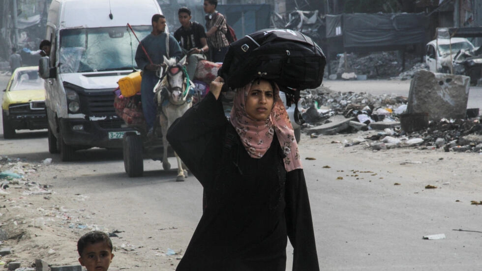 A displaced Palestinian woman flees Jabalia, after an Israeli evacuation order, for Gaza City in northern Gaza on May 12, 2024. © Mahmoud Issa, Reuters