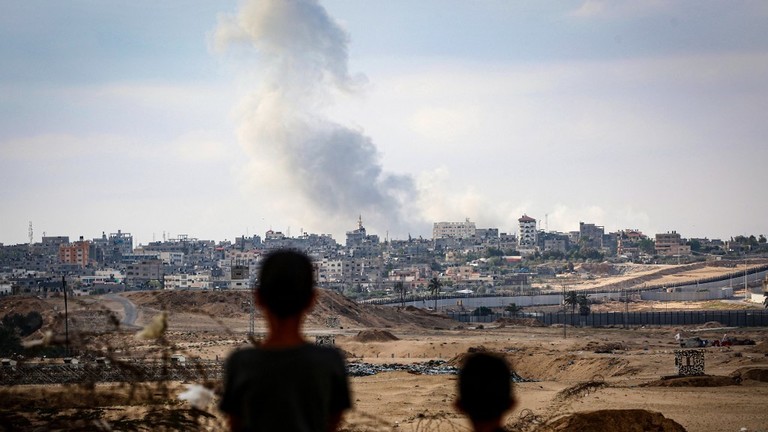 Boys watch smoke billowing during Israeli strikes east of Rafah, Gaza, May 13, 2024 © AFP