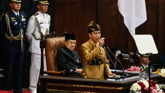 FILE PHOTO: Indonesias President Joko Widodo (R) delivers his state of the nation address ahead of the countrys Independence Day as seen with his Vice Jusuf Kalla (L) at the Parliament building in Jakarta, Indonesia on August 16, 2019. © Anton Raharjo/NurPhoto via Getty Images