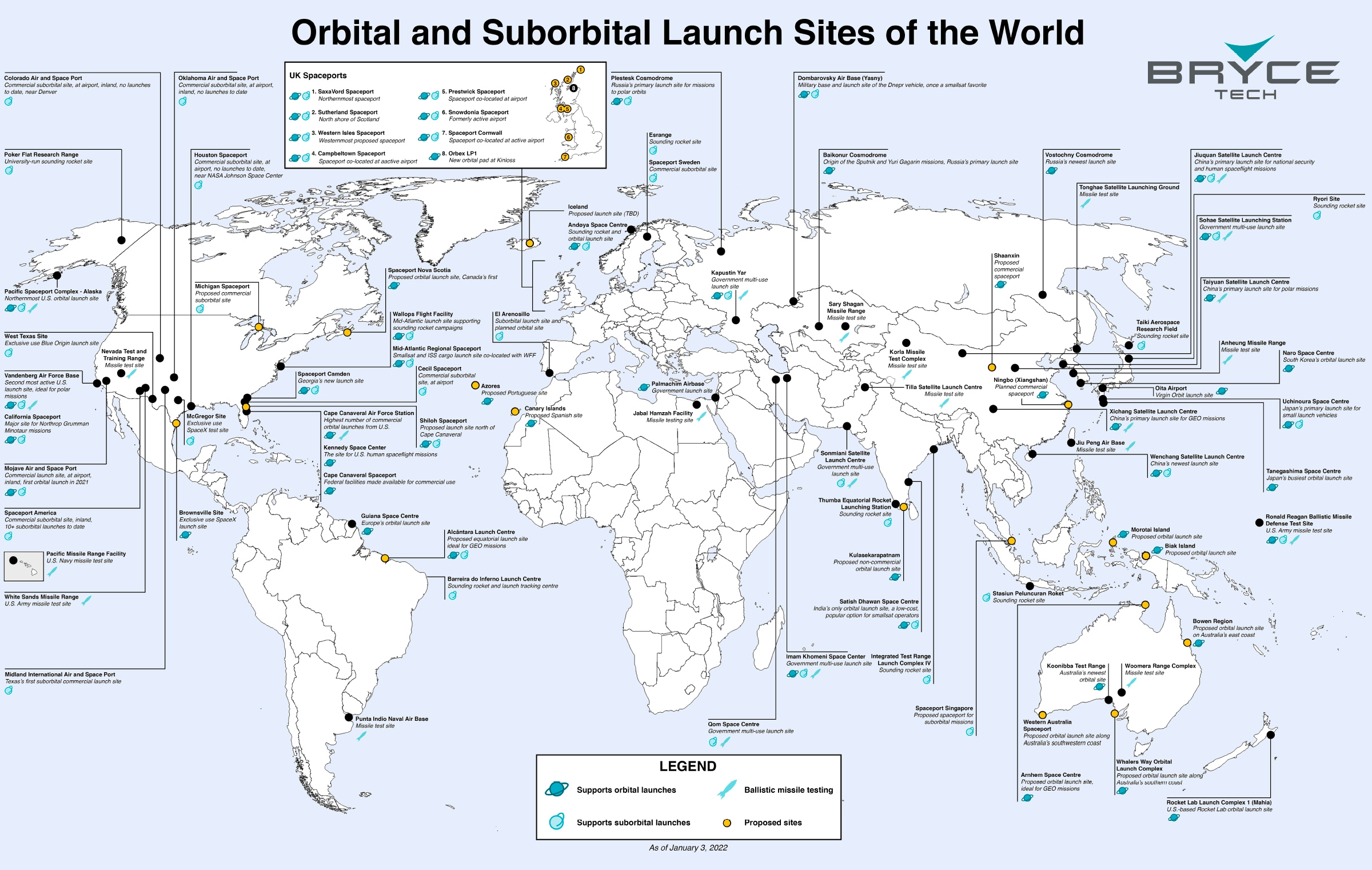 The map above, from BryceTech, is a comprehensive look at the world’s spaceports (both orbital and sub-orbital) as well as ballistic missile test sites.