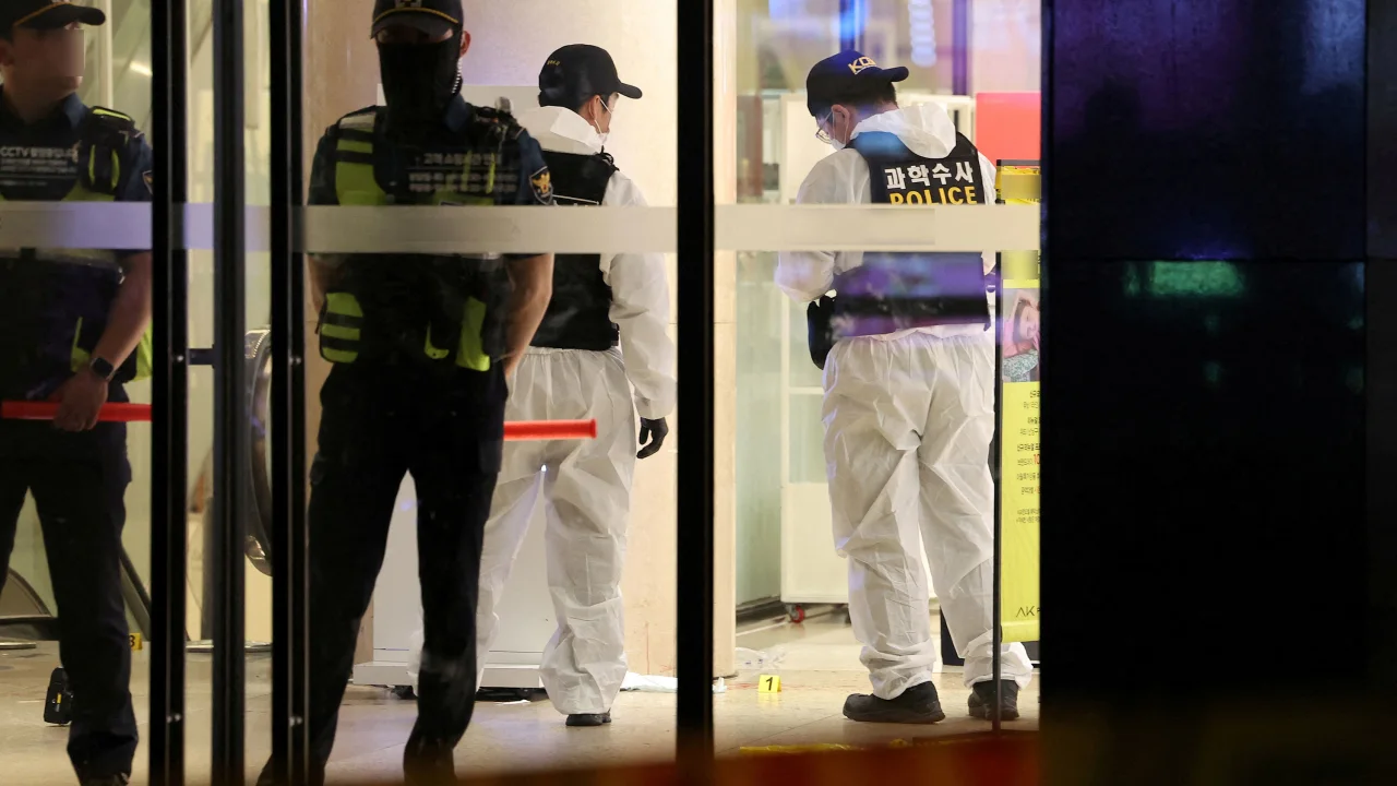 Policemen examine a scene where at least 14 people were injured in Seongnam, South Korea, on August 3, 2023.