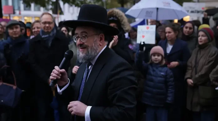Dovid Roberts speaking to participants of a vigil outside Berlin's community center and synagogue of...