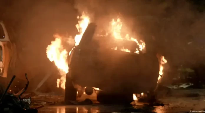 A vehicle is seen on fire at the site of an explosion outside the Karachi airport, Pakistan, on October 6, 2024