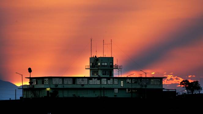 The sun sets behind the Commission's building where hearings were held at Guantanamo...