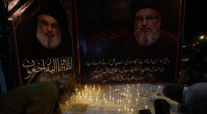 Shiite Muslims light candles during a protest against the killing of Hezbollah leader Hassan Nasrallah, in Karachi, Pakistan, Saturday,...