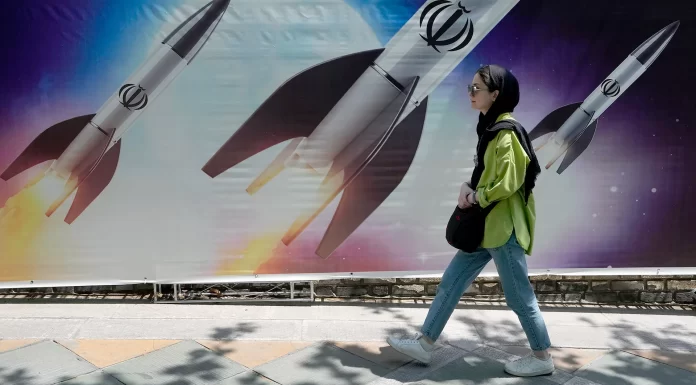 FILE: A woman walks past a banner showing missiles being launched, in northern Tehran, 19 April 2024
