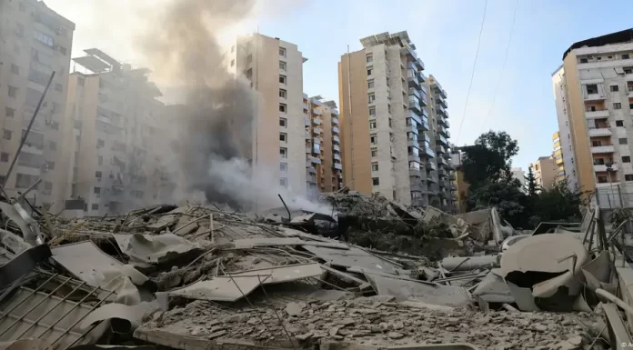 Smoke rises from the site of an Israeli airstrike that targeted a neighbourhood in Beirut’s southern suburb on...