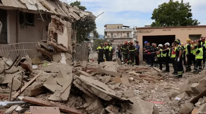 Firefighters work at the site of a collapsed building in Saviano, in the Campania region, Italy, September 22, 2024.