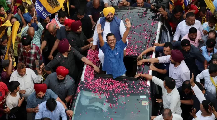 Delhi Chief Minister Arvind Kejriwal gestures during a roadshow