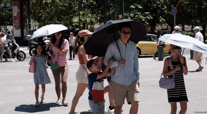 Tourists are using umbrellas to protect from the sun during a heatwave in Athens, Greece