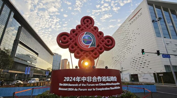 A decoration for the 2024 Summit of Forum on China-Africa Cooperation (FOCAC) is seen on display near the China National Convention Center in Beijing on August 30, 2024. This year's FOCAC will be held in...