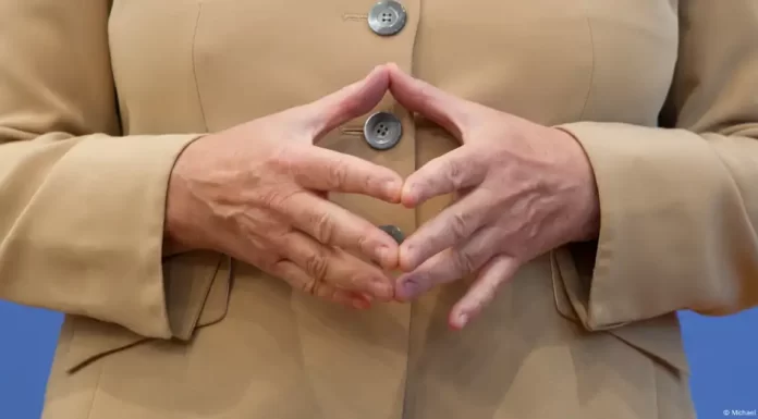 Angela Merkel's hands held in front of her stomach, thumbs and fingertips touching to form a diamond shape