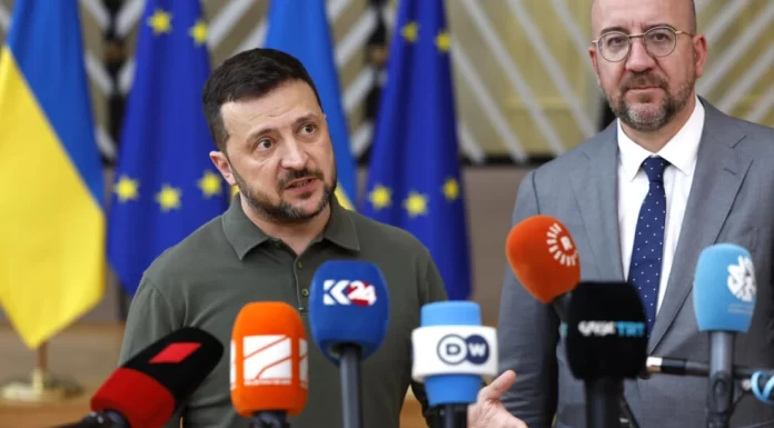 Ukraine's President Volodymyr Zelenskyy, left, and European Council President Charles Michel speak with...