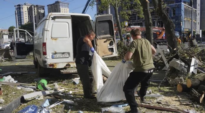 Workers carry a dead body killed after an apartment building was hit by Russian air bomb killing at least three and injuring 23, in Kharkiv, Ukraine, Saturday, June 22nd 2024