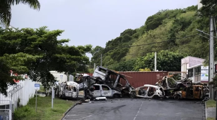 Car wreckages at a makeshift roadblock at the entrance of Ducos industrial zone,...