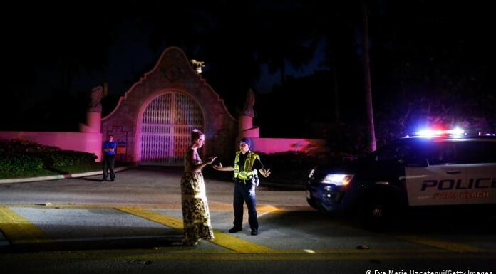 A woman talks to Palm Beach police officer in front of former President Donald Trump's house...