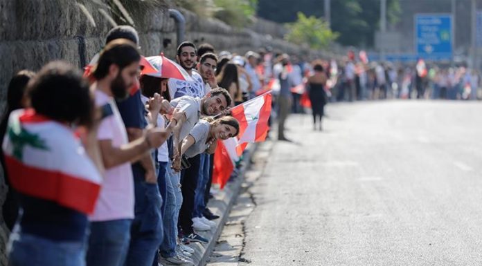 Demonstrators on Sunday joined hands from Tripoli to Tyre, a 170-kilometre (105-mile) chain running...