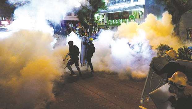 Hong Kong riot police fired repeated teargas rounds yesterday evening at pro-democracy protesters in a popular tourist district, as violence rocked the international finance hub once more despite increasingly stern warnings from China.