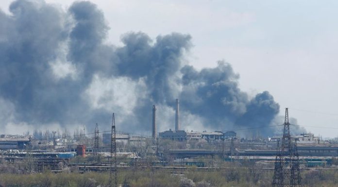 Smoke rises above a plant of Azovstal Iron and Steel Works company in Mariupol