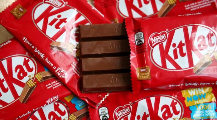 FILE PHOTO: Kit Kat chocolate covered wafer bars manufactured by Nestle are seen in London