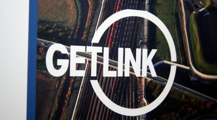 FILE PHOTO: The logo of Channel tunnel operator Getlink, formerly known as Eurotunnel, is seen during the company’s 2018 annual results presentation in Paris