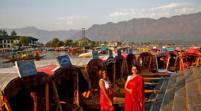 FILE PHOTO: Tourists pose on parked “Shikaras” or boats on the banks of Dal Lake in Srinagar