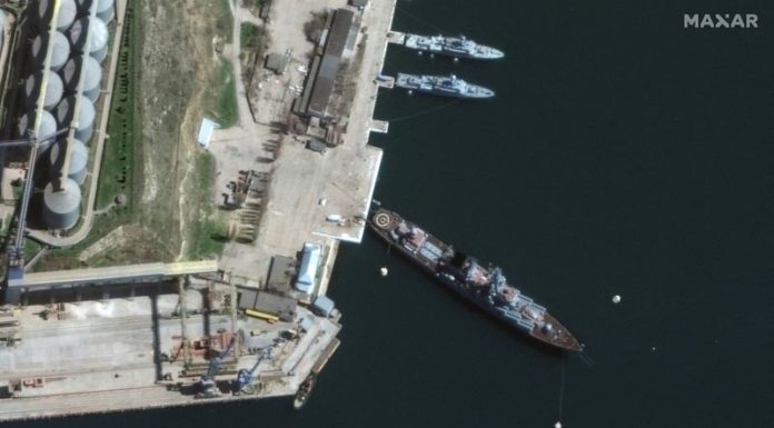A satellite image shows a view of Russian Navy’s guided missile cruiser Moskva at port, in Sevastopol