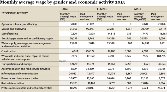 According to the QSA Labour Force Survey for the third quarter of 2014, average monthly wage in Qatar was QR 10,761, up 10 percent from 2013.
