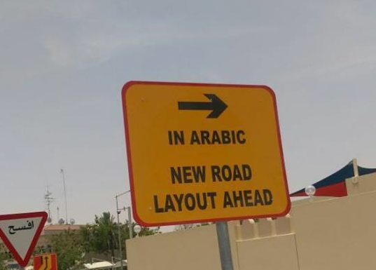 The sign, which read “In Arabic/New Road Layout Ahead,” appears to be missing the actual Arabic translation of the message.