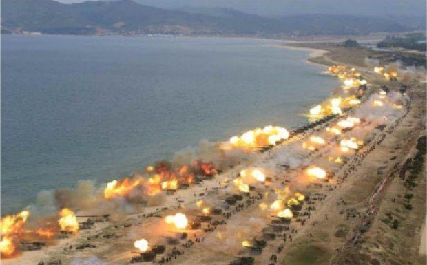 Balls for fire shoot out of the muzzles of hundreds of North Korean tanks and artillery pieces during the firing drill on April 26, 2017, which Pyongyang said was the largest ever. SCREENGRAB FROM NORTH KOREAN RODONG SINMUN