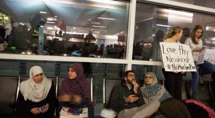 Protesters gather to denounce President Donald Trump's executive order that bans certain immigration, at Dallas-Fort Worth International Airport on January 28, 2017 in Dallas, Texas. President Trump signed the controversial executive order that halted refugees and residents from predominantly Muslim countries from entering the United States. G. Morty Ortega/AFP