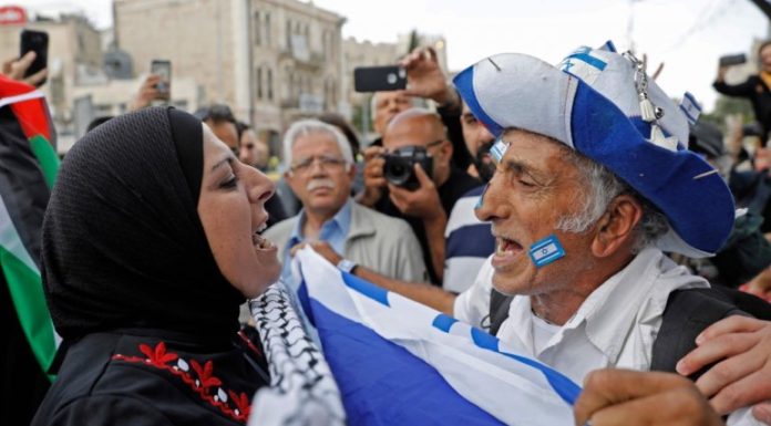 An Israeli man confronts a Palestinian woman at Damascus gate in Jerusalem on May 13, 2018, as Israeli nationalist settlers celebrate the Jerusalem Day in the Old City. AFP / Menahem Kahana