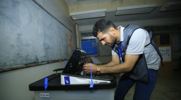 Iraqi polling station staff is seen after polls closed for the Iraqi parliamentary election in Baghdad, Iraq on May 12, 2018. Murtadha Sudani - Anadolu