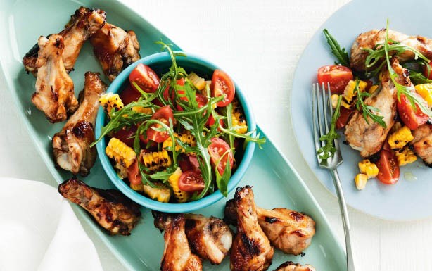 Sticky chicken drumettes with grilled corn and rocket salad
