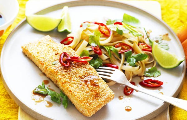 Sesame salmon with ginger rice noodles