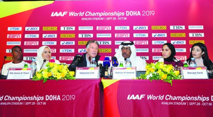 Sheikha Asma Al Thani (second left), Director of Marketing and Communications of Doha 2019 World Championships Local Organising Committee (LOC), Sebastian Coe (third left), President of the International Association of Athletics Federations (IAAF), Vice Chairman and Director General of the Doha 2019 LOC and Vice President of the IAAF, Dahlan Al Hamad (fourth left) and...