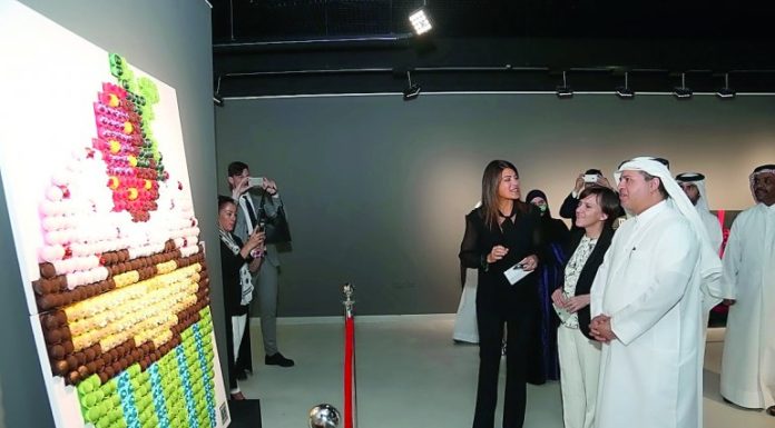 Ahmed Abdul Rahman Al Sayed, Deputy General Manager of Katara, and Carlotta Colli, Charge d’ Affaires at the Italian Embassy in Qatar, and Italian artist Elisabetta Farina at the opening of the “Beautiful to eat, Good to look at” exhibition at Katara.