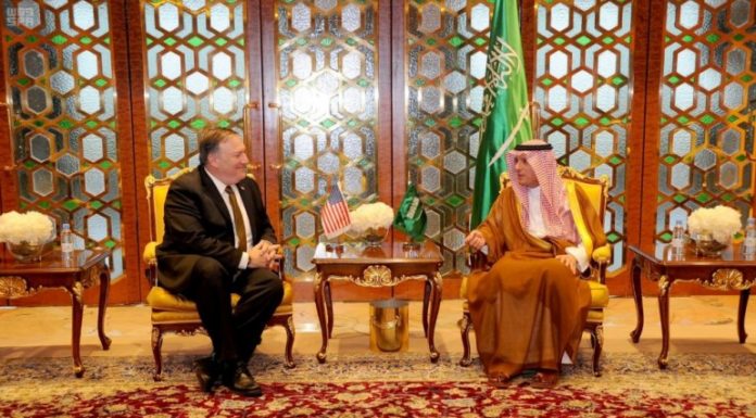 U.S. Secretary of State Mike Pompeo meets with Saudi Foreign Minister Adel Al-Jubeir in Riyadh, Saudi Arabia April 28, 2018. Saudi Press Agency/Handout via REUTERS
