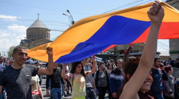Armenian opposition supporters march in Yerevan on April 26, 2018. / AFP / KAREN MINASYAN