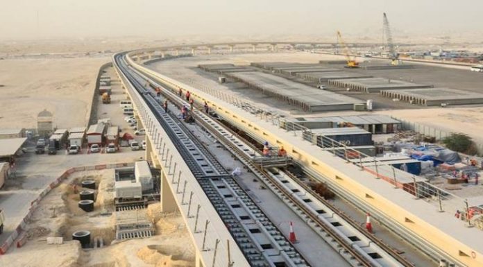Track works continue along the elevated viaducts of the Metro Red Line near Qatar University.