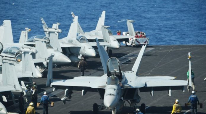 Sailors preapre FA-18 Hornet fighter jets for take off during a routine training aboard the US aircraft carrier Theodore Roosevelt in the South China Sea on April 10, 2018. AFP / Ted Aljibe