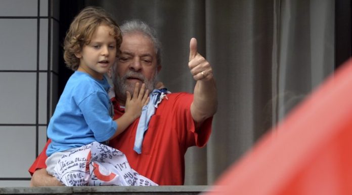 Luiz Inacio Lula da Silva holds his grandson Pedro while waves supporters from the balcony of his apartment in Sao Bernardo do Campo, some 25 km from Sao Paulo, Brazil, on March 13, 2016. AFP / Nelson Almeida