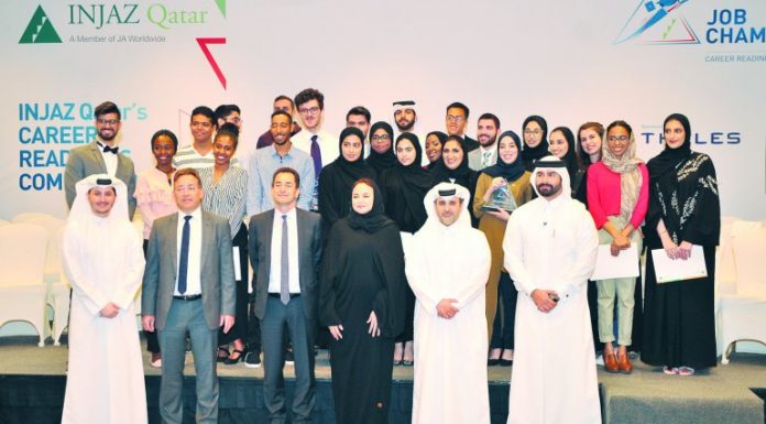 From second left: Frederic Sallet, Thales CEO; Eric Chevallier, French Ambassador to Qatar; Sheikha Hanadi bint Nasser Al Thani, INJAZ Chairperson; Abdulla Abdulaziz Al Subaie, Qatar Rail CEO and Emad El Khaja, INJAZ CEO, with the contestants during the awarding ceremony of the Job Champions Competition held at Four Seasons Hotel, yesterday. Pic: Baher Amin...