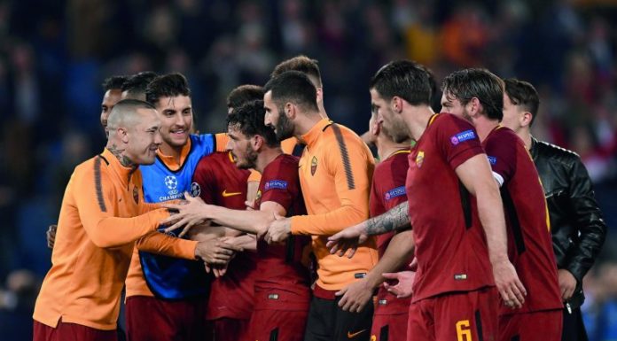 Players of AS Roma celebrate after the UEFA Champions League quarters soccer match between AS Roma and FC Barcelona at the Stadio Olimpico in Rome, Italy on April 10, 2018.Claudio Pasquazi/ Anadolu Agency