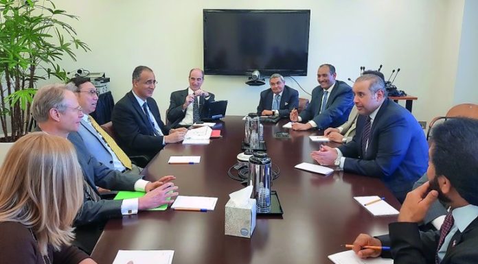 Minister of Economy and Commerce, H E Sheikh Ahmed bin Jassim bin Mohammed Al Thani, during the meeting with International Monetary Fund officials in Washington, DC, yesterday.