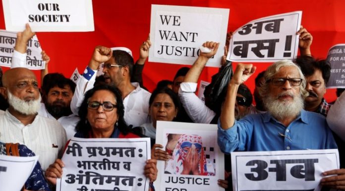 People shout slogans and hold placards during a protest against the rape of an eight-year-old girl, in Kathua, near Jammu and a teenager in Unnao, Uttar Pradesh state, in Mumbai, India April 13, 2018. REUTERS/Francis Mascarenhas