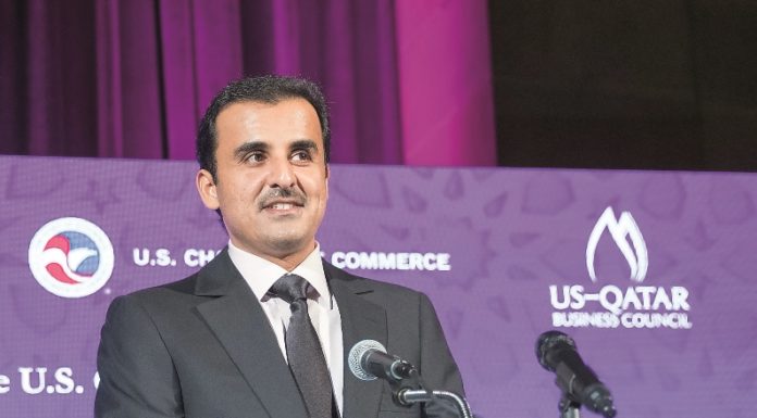Emir H H Sheikh Tamim bin Hamad Al Thani interacting with dignitaries during the reception held by the US-Qatar Business Council and the Chamber of Commerce of the US, at the Chamber’s headquarters.
