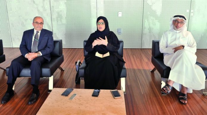 Jury members of the inaugural Akhlaquna Award (from left), Dr Emad El Din Shahin, Dean of College of Islamic Studies at Hamad bin Khalifa University, Amal Al Mannai, Chief Executive Officer of Qatar Foundation for Social Work, and Dr. Jassim Al Sultan, Director-General at Wijdan Cultural Center, during a media briefing held at Qatar Foundation...