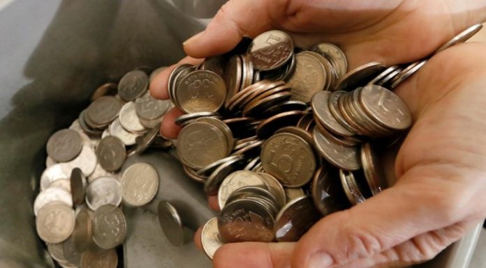 A cashier places 5 rouble coins into a counting machine at an office in Krasnoyarsk, Russia, January 22, 2016. Reuters/Ilya Naymushin